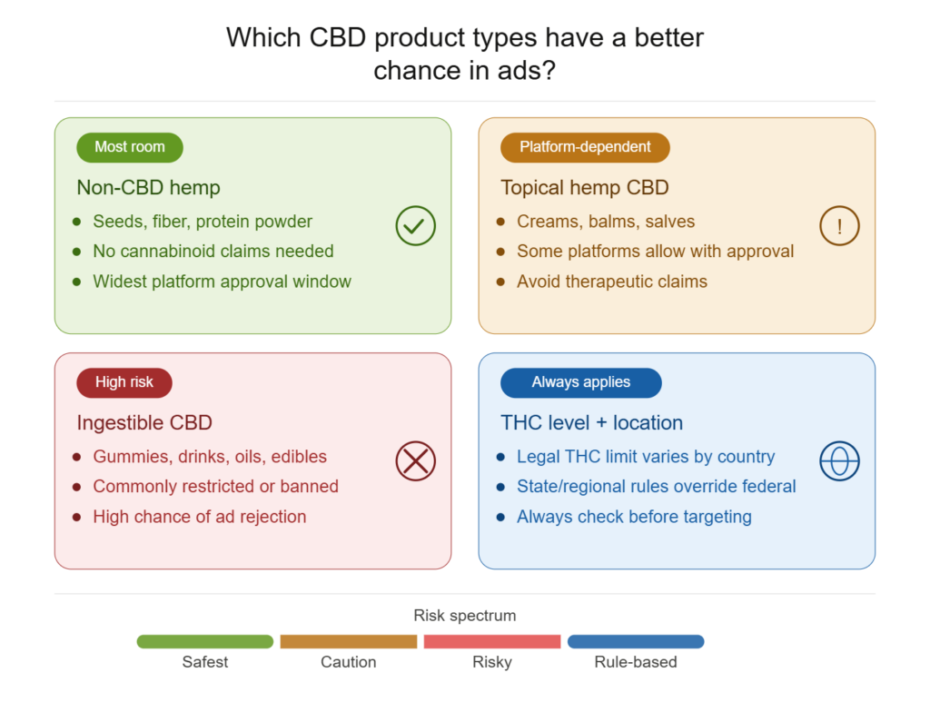 ⚠️ Harder to advertise: Ingestible CBD, strong product claims, and health-related wording.
