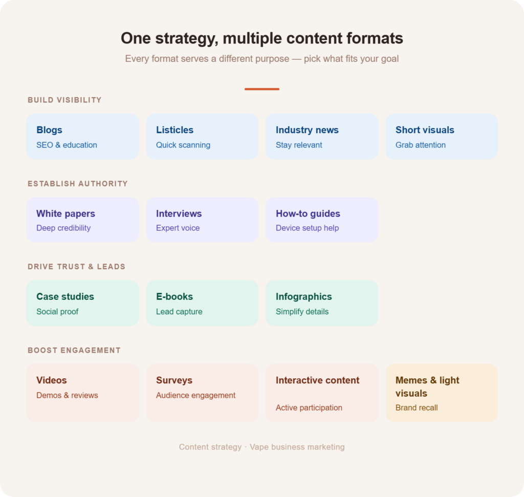 That is why vape businesses should stop thinking only in terms of “we need more blogs.” The better approach is to build content around a few clear pillars, then choose the format that best fits each one.
