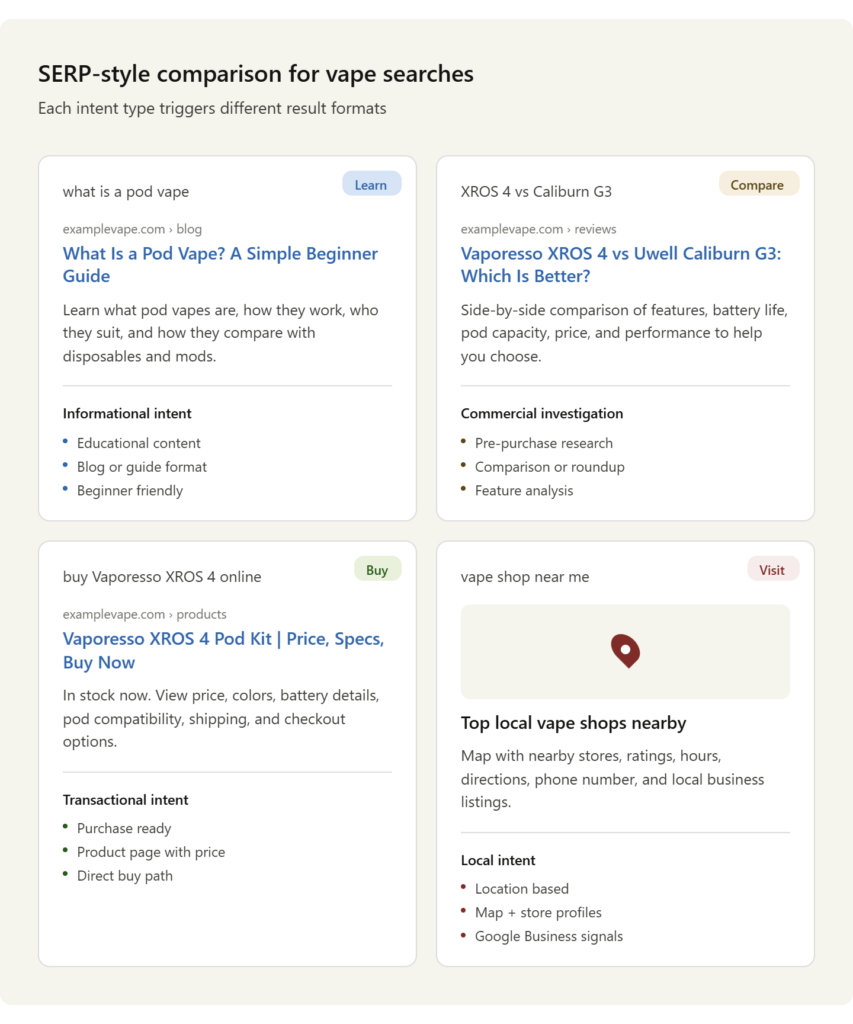 | Local intent | To find a nearby shop or local option | vape shop near me, vape store in Dallas, buy vape pods near me | Location page, Google Business Profile, store page |