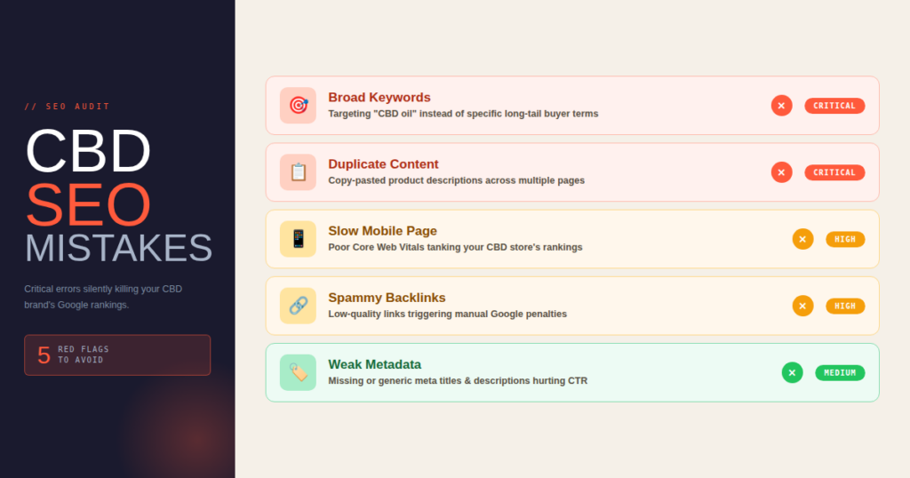 In the CBD space, small SEO mistakes can slow growth faster because the niche already faces tighter scrutiny, stronger competition, and a bigger trust barrier.