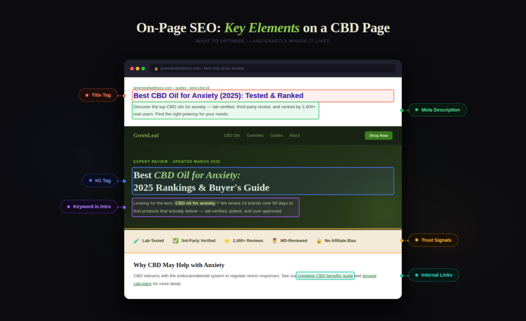 Good CBD on-page SEO helps Google understand what the page is about, and it also makes the page easier for people to scan, trust, and act on.