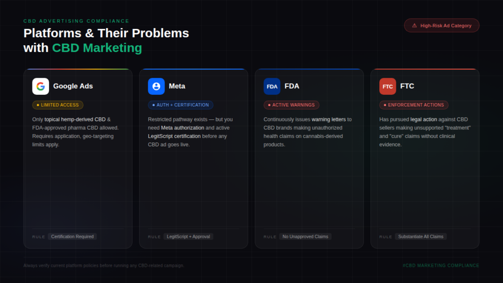 - Meta has a restricted pathway for CBD ads, and advertisers need authorization plus active LegitScript certification.